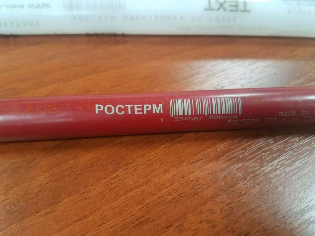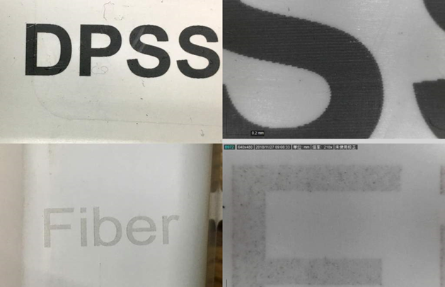 Рис. 13. Сравнение маркировки трубы волоконным лазером (1064 нм) и УФ-лазером (355 нм): волоконный плавит материал, УФ-осветляет.