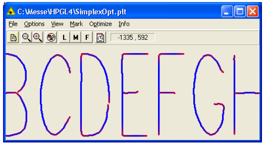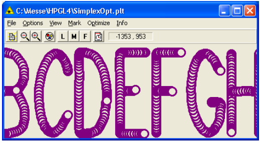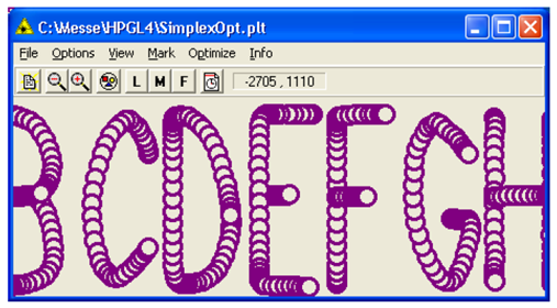 Рис. 5. Моделирование для маркировки 1000 символов в секунду высотой 1 мм. Необходимая скорость маркировки составляет 3,6 м / с, и моделирование показывает лазерные пятна около 50 мкм, выполненные с частотой лазера 100 кГц.