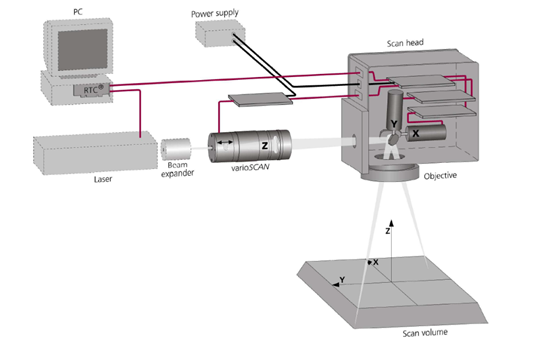 Рис. 1. Компоненты системы лазерной обработки материалов. Сканирующая головка состоит из пары зеркал, установленных на гальванометрических сканерах, вращаемых с помощью (аналоговых или цифровых) серводвигателей. Цифровой интерфейс используется для передачи управляющих данных с ПК на сканирующую головку, а также для обеспечения доступности сигналов обратной связи при наличии цифровых серводвигателей. Для фокусировки лазерного луча в поле / объеме сканирования или на заготовке, может быть исползан объектив с плоским полем или оптика с динамической фокусировкой (varioSCAN).