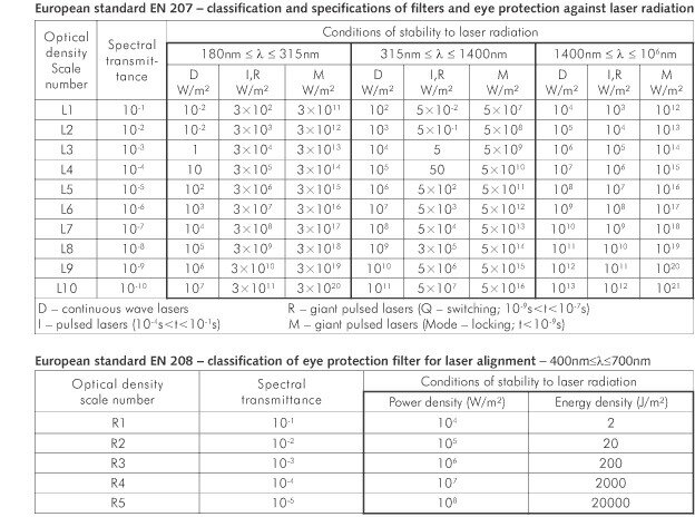 - Устойчивость к излучению. Это минимальное значение мощности (или энергии), которое соответствует защитному фильтру заданного класса. Найдите устойчивость к лазерному излучению (адекватную для полной защиты) в таблицах - самое близкое значение для вашего расчета. Запись идентифицирует спектральный коэффициент пропускания и оптическую плотность (масштабное число).