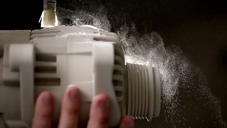 - Удаление порошка. В готовой модели могут остаться неспеченный рабочий материал. Чтобы его удалить, прорезают специальные отверстия. Чтобы существенно упростить последующие работы, рекомендуется еще в прототипе добавить минимум 2 таких отверстия, диаметром более 5 мм.