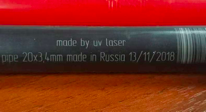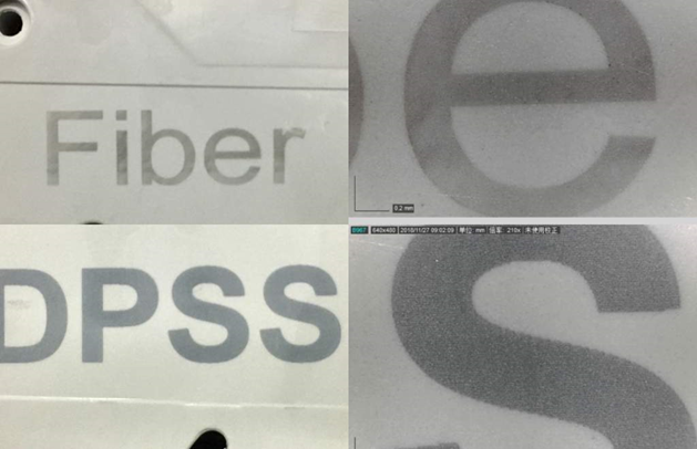 Рис. 13. Сравнение маркировки трубы волоконным лазером (1064 нм) и УФ-лазером (355 нм): волоконный плавит материал, УФ-осветляет.