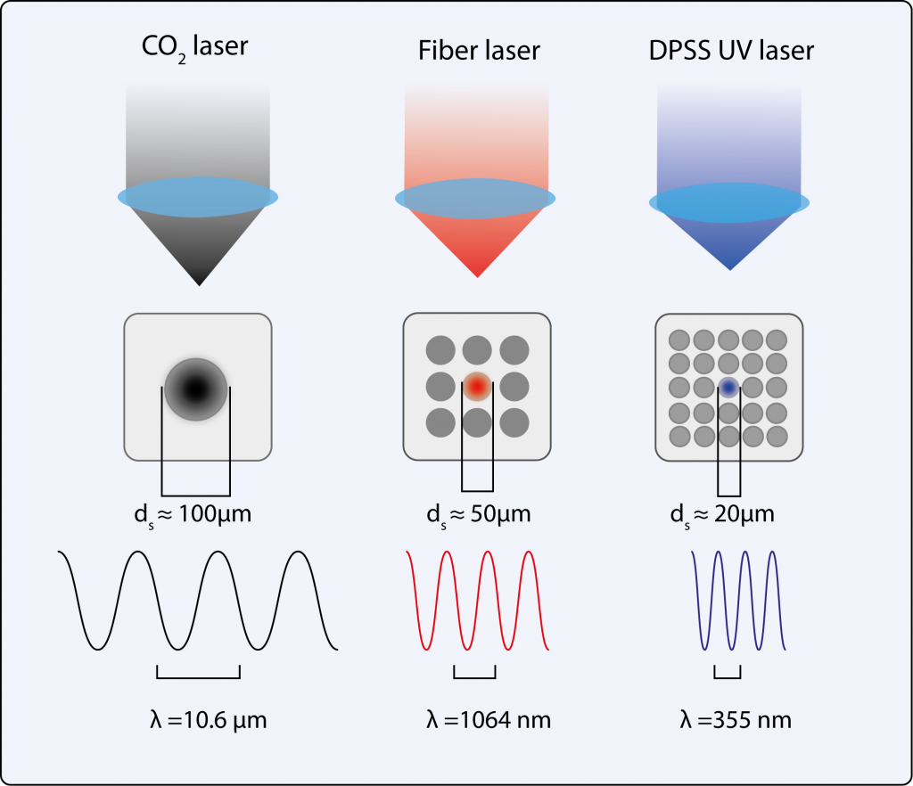 Излучение с длиной волны 355 нм подходит для обработки широкого спектра материалов (как металлов, так и неметаллов). Позволяет выполнять точную маркировку термочувствительных элементов за счет меньшего диаметра пятна и механизма так называемой "холодной абляции". Эффект "холодной абляции" осуществляется за счет высокоэнергетических УФ квантов, которые модифицируют материал в ходе фотохимический реакции.