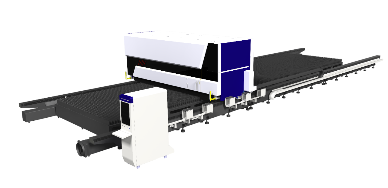 Основой подвижный элемент оборудования, портал, установленный поперек между направляющими оси Y, и приводится в движение с обеих сторон мощными сервоприводами. На портале установлены различные компоненты станка, например, транспортное волокно источника (система доставки луча), ось Z, режущая головка, защитная кабина с вентиляторами, система видеонаблюдения.